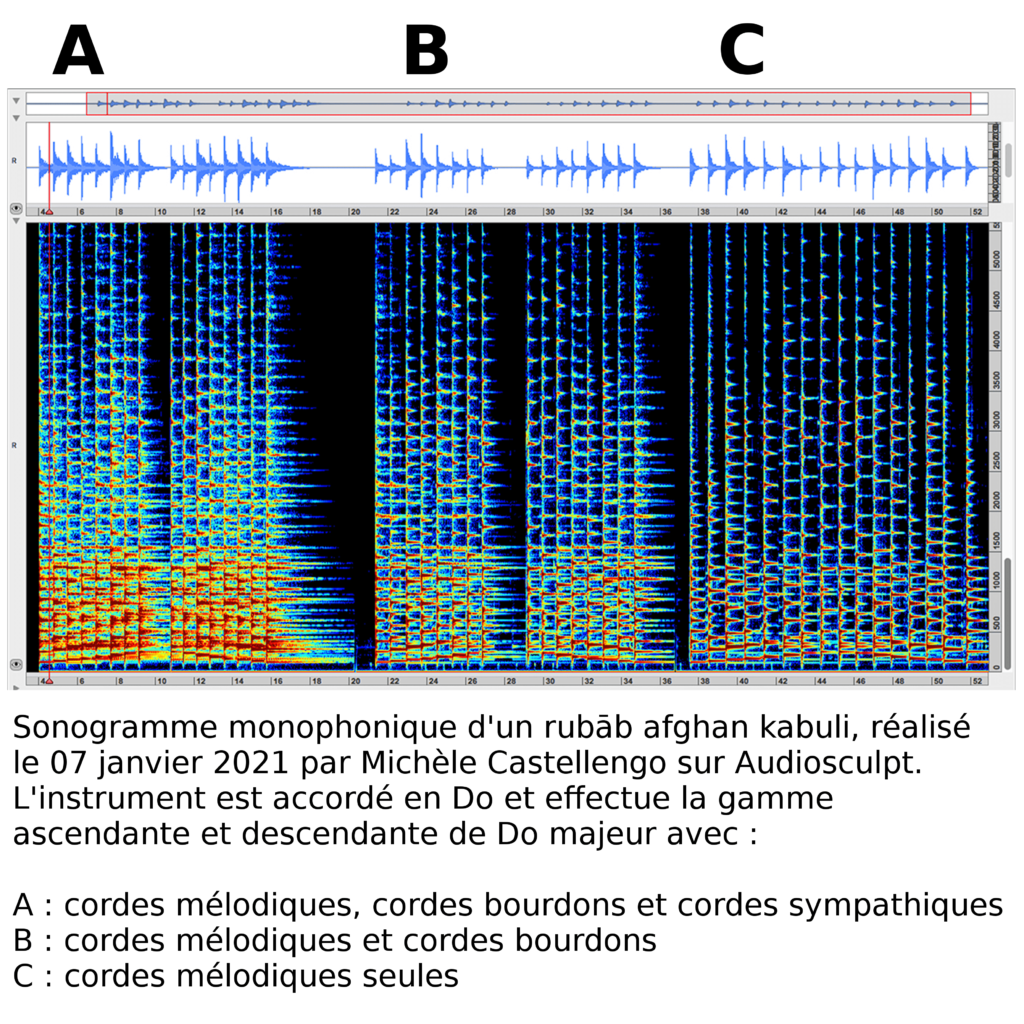 Les cordes sympathiques participent grandement à la constitution du timbre de l’instrument. Elles doublent les notes émises par les cordes mélodiques, mais il est fréquent que d’autres cordes sympathiques se mettent également à vibrer (image sonogramme A). Les cordes sympathiques génèrent un halo sonore, une sorte de réverbération mécanique analogue à celle d’une grande salle vide. Cet effet est désigné par Charles Besnainou et Michèle Castellengo de « cathédrale » (Besnainou, Castellengo 1995 : p. 61). On aurait tendance à penser que la présence de cordes sympathiques augmenterait l’intensité sonore de l’instrument, mais dans les faits, il n’y a pas de différence significative (image sonogramme C). Le niveau d’intensité sonore est identique aux trois sonogrammes (image sonogrammes A, B et C). Le prolongement du son, désigné par « l’effet rebond », est d’une intensité bien plus faible que celle produite par la corde excitatrice.